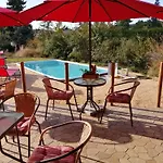 Von einer Terrasse dieser Villa aus können Gäste einen Ausblick auf den Garten genießen. Zur Ausstattung des Badezimmers gehören eine getrennte Toilette und eine Dusche sowie ein Haartrockner und Handtücher.